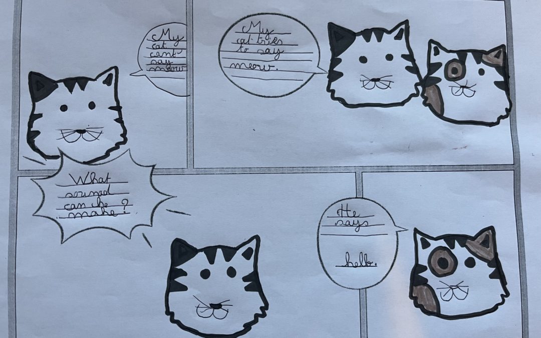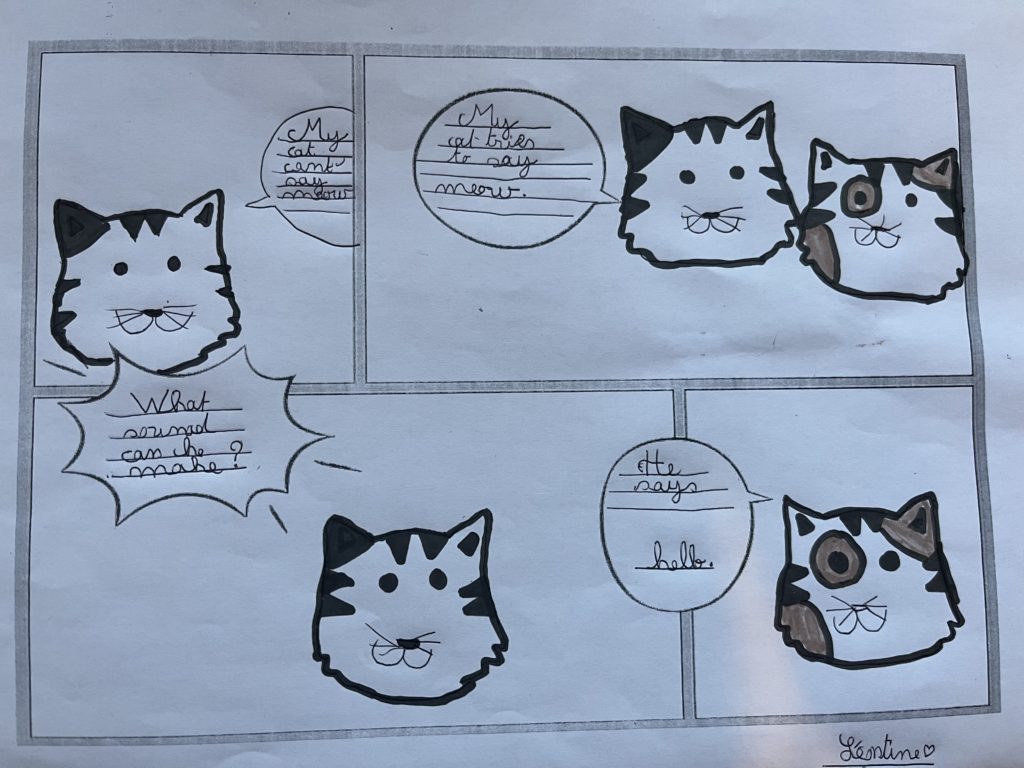 Over the past few weeks, students in grades CP-CE1-CE2 have been encouraged to express themselves in English by creating a four-panel comic strip inspired by the book « Bark George ».