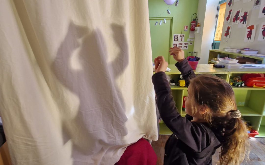 Comme un spectacle, les élèves sont passés tour à tour derrière le rideau pour faire deviner leurs ombres aux autres petits spectateurs! Moments magiques ! Loup, lapin, escargot, oie, kangourou, cheval .. se sont animés pour leur grand plaisir. Cela a été aussi l’occasion de comprendre que la distance entre la lumière et le corps et aussi le drap blanc est déterminante pour la netteté de l’ombre.